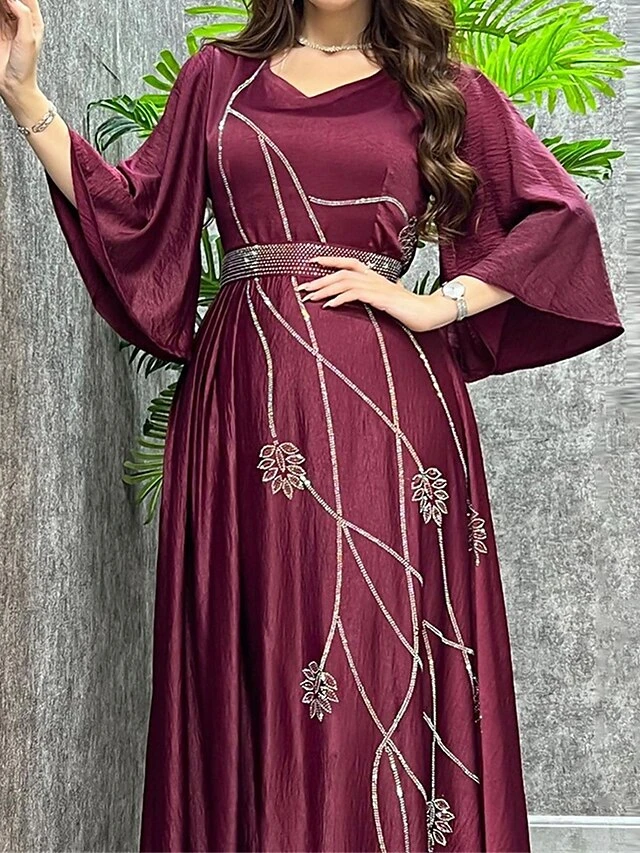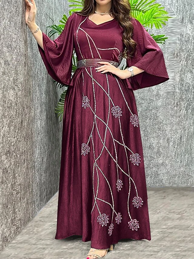 Women’s Prom Dress Party Dress Swing Dress Long Dress Maxi Dress Wine Dark Blue Light Blue 3/4 Length Sleeve Leaf Beads Spring Fall Winter V Neck Fashion Winter Dress Wedding Guest Evening Party 2023