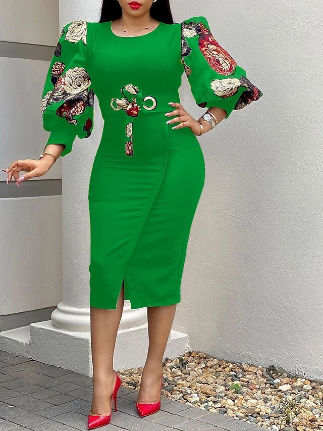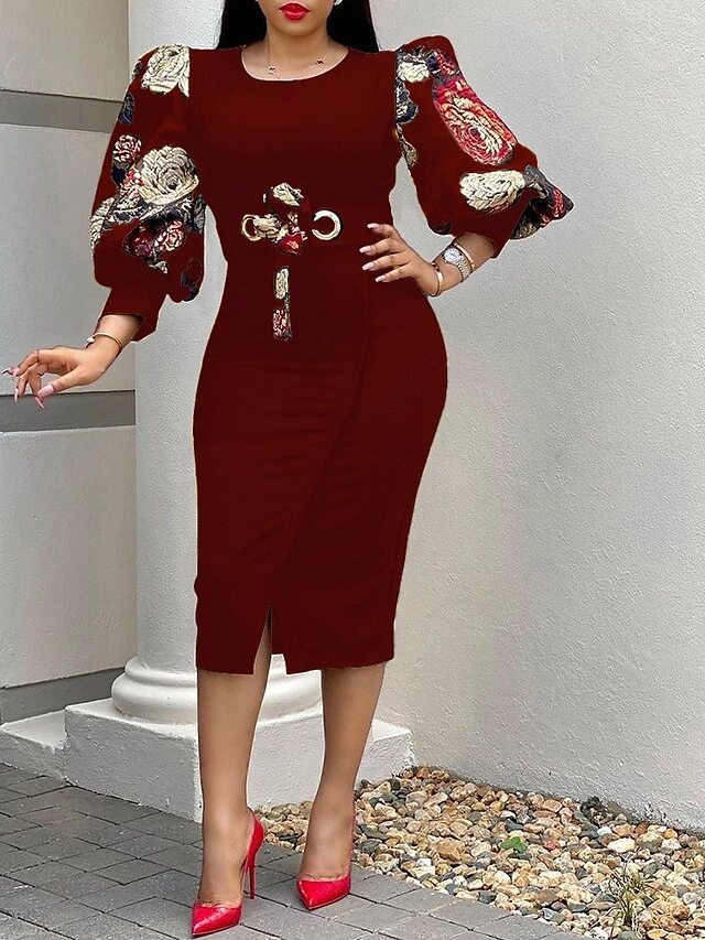 Women‘s Sheath Dress Knee Length Dress Black White Yellow Long Sleeve Floral Puff Sleeve Winter Fall Autumn Crew Neck Party Winter Dress Fall Dress Slim 2023 S M L XL XXL XXXL