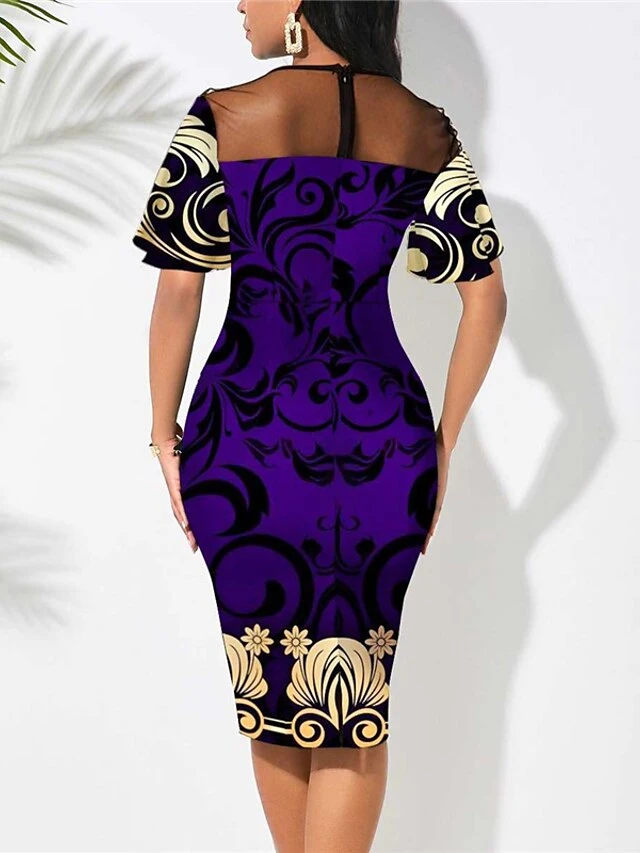 Women‘s Sheath Dress Midi Dress Purple Short Sleeve Floral Print Spring Summer Crew Neck Work 2023 S M L XL XXL 3XL