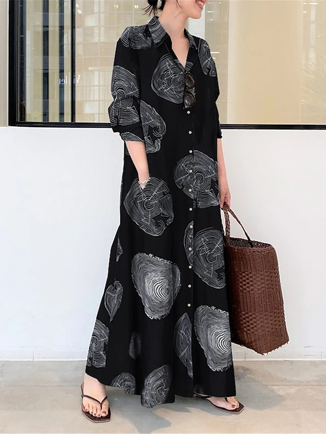 Women’s Shirt Dress Casual Dress Cotton Linen Dress Maxi Long Dress Cotton Blend Basic Casual Outdoor Daily Shirt Collar Button Pocket Long Sleeve Summer Spring Fall 2023 Loose Fit Black White Yellow