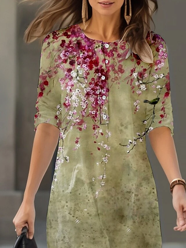 Women’s Shirt Dress Casual Dress Cotton Linen Dress Midi Dress Polyester Fashion Casual Daily Outdoor Daily Vacation Crew Neck Button Print 3/4 Length Sleeve Spring Fall Autumn 2023 Loose Fit Yellow
