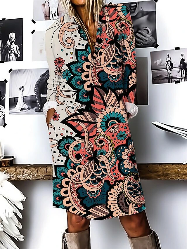 Women’s Shirt Dress Casual Dress Cotton Linen Dress Midi Dress Polyester Fashion Casual Daily Outdoor Daily Vacation Shirt Collar Button Print 3/4 Length Sleeve Fall Winter Autumn 2023 Loose Fit