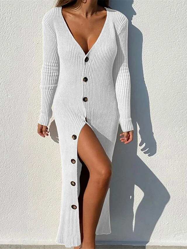 Women’s Sweater Dress Jumper Dress Casual Dress Long Dress Maxi Dress Warm Pure Color Outdoor Casual Holiday Vacation V Neck Long Sleeve Button 2023 Regular Fit Black White Pink S M L XL XXL 3XL