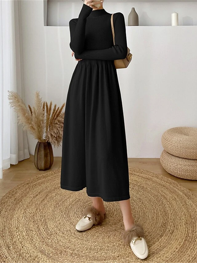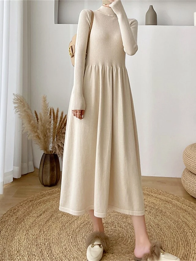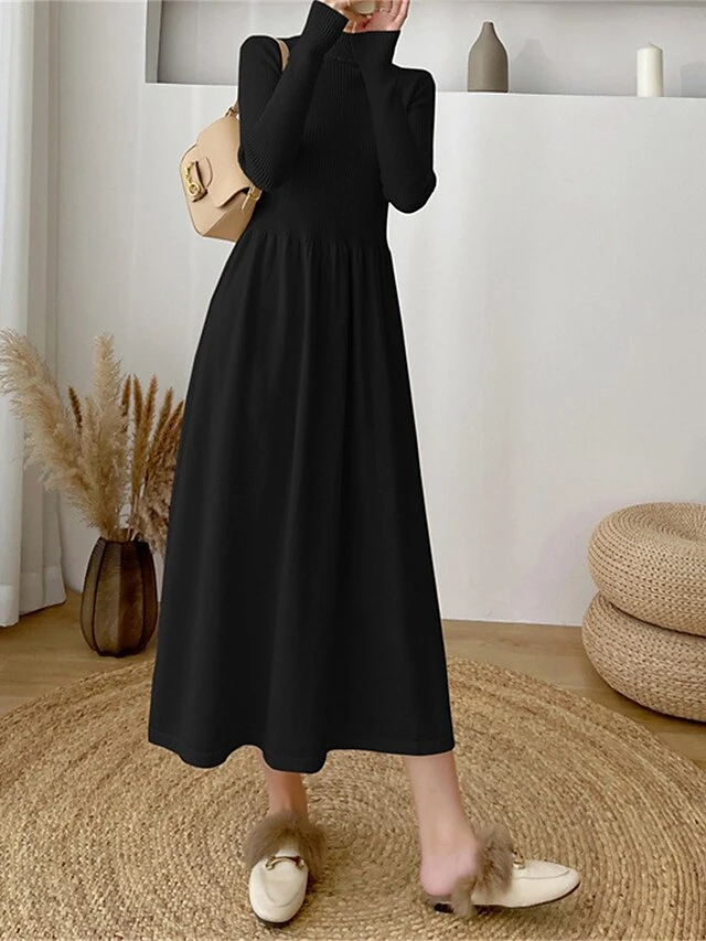 Women’s Sweater Dress Jumper Dress Casual Dress Midi Dress Fashion Plain Outdoor Daily Going Out Turtleneck Long Sleeve 2023 Loose Fit Black Apricot One Size