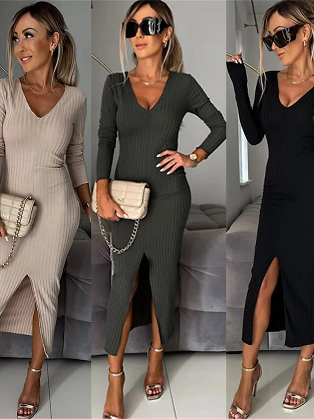 Women’s Sweater Dress Jumper Dress Casual Dress Midi Dress Fashion Plain Outdoor Daily Vacation Going Out V Neck Long Sleeve 2023 Regular Fit Black Green Khaki S M L XL XXL