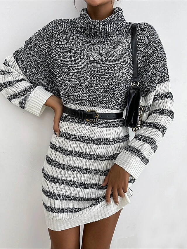 Women’s Sweater Dress Winter Dress Jumper Dress Mini Dress Patchwork Ribbed Daily Date Going Out Fashion Basic Turtleneck Long Sleeve 2023 Loose Fit Gray Color S M L Size