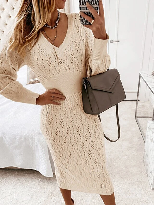 Women‘s Sweater Dress Winter Dress Midi Dress White Long Sleeve Pure Color Ruched Winter Fall V Neck Casual M L XL XXL 3XL