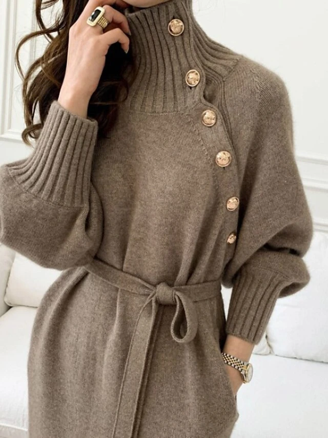 Women‘s Sweater Dress Winter Dress Sheath Dress Knee Length Dress Black Khaki Beige Long Sleeve Pure Color Button Fall Winter Autumn Turtleneck Stylish Winter Dress Fall Dress Loose Fit 2023 One-Size