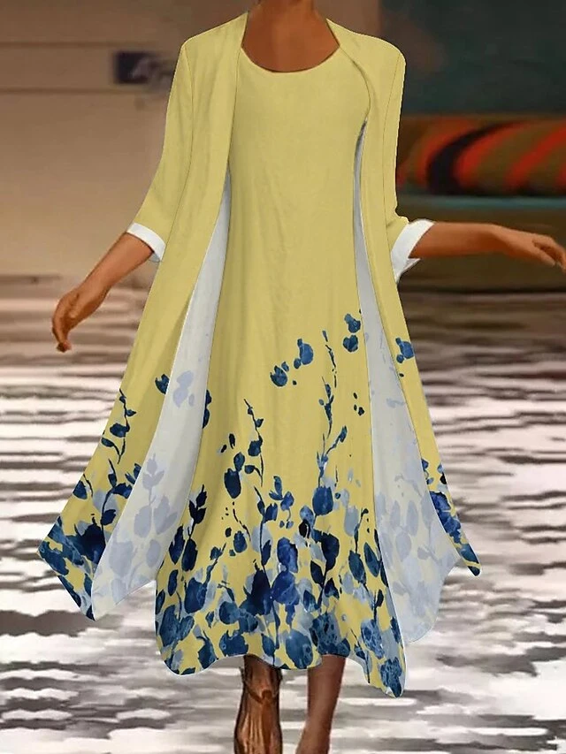 Women’s Two Piece Dress Long Dress Maxi Dress White Yellow Pink Long Sleeve Color Block Print Summer Spring Crew Neck Stylish Winter Dress Fall Dress Loose Fit 2023 S M L XL XXL 3XL 4XL 5XL