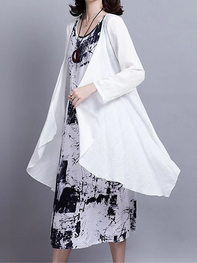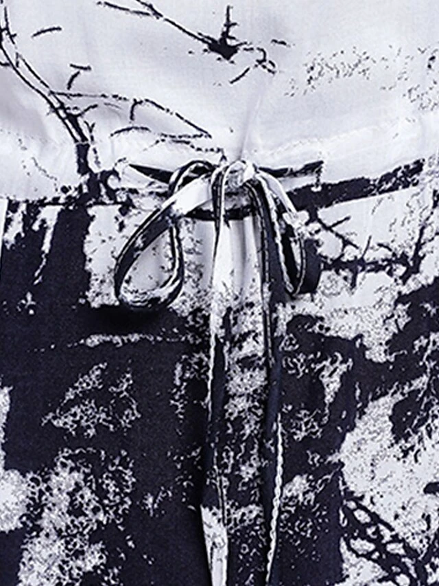 Women’s Two Piece Dress Set Casual Dress Cotton Linen Dress Daily Holiday Fashion Streetwear Pocket Drawstring Midi Dress Crew Neck Long Sleeve Painting Print Loose Fit Black Dark Blue Fall Winter M