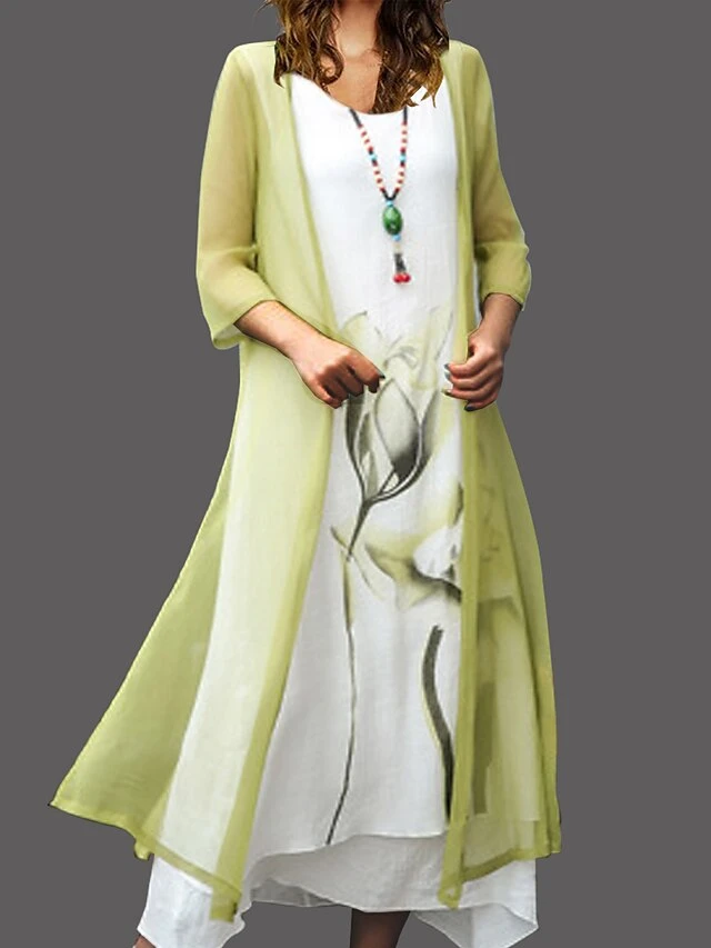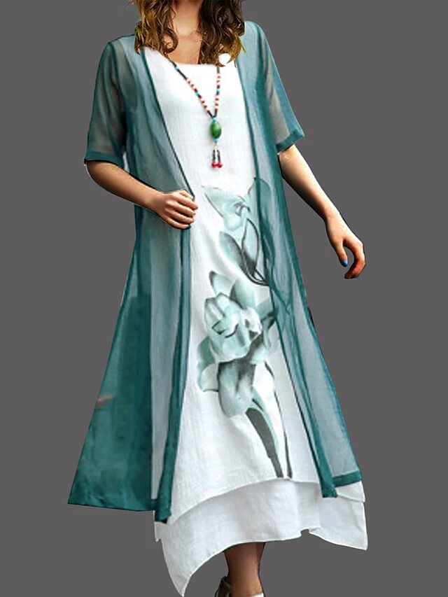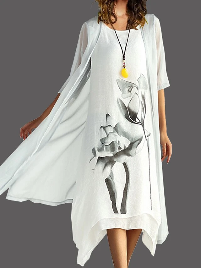 Women’s Two Piece Dress Set Casual Dress Cotton Linen Dress Outdoor Daily Fashion Casual Fake Two Piece Print Midi Dress Crew Neck Short Sleeve Floral Painting Regular Fit Yellow Pink Red Summer