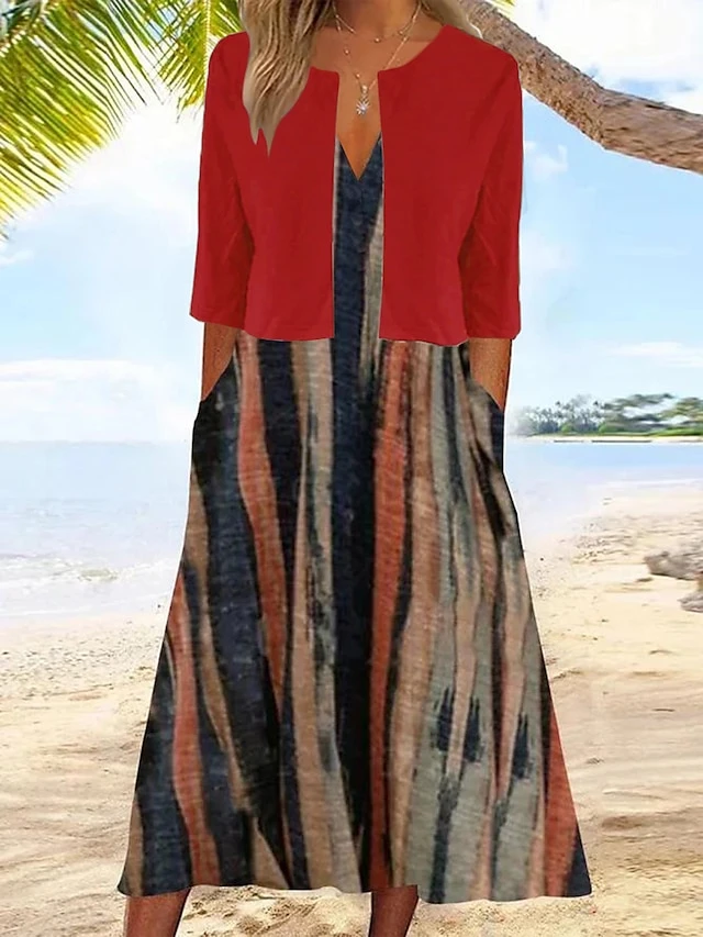 Women’s Two Piece Dress Set Casual Dress Dress Set Outdoor Daily Fashion Streetwear Pocket Print Midi Dress V Neck Half Sleeve Stripe Regular Fit Red Summer Spring S M L XL XXL