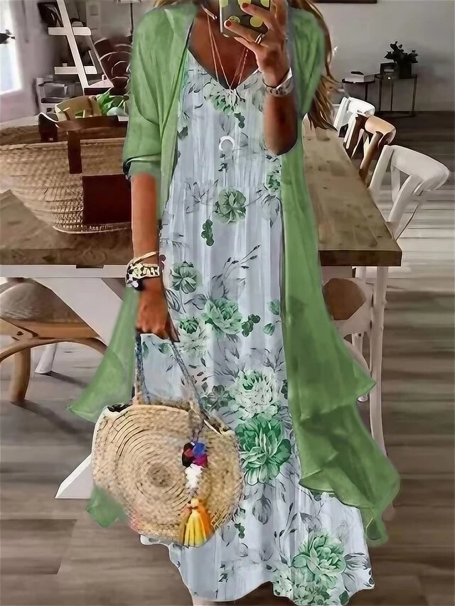 Women’s Two Piece Dress Set Casual Dress Print Dress Outdoor Daily Fashion Casual Print Long Dress Maxi Dress Crew Neck 3/4 Length Sleeve Floral Loose Fit Blue Green Summer Spring S M L XL XXL