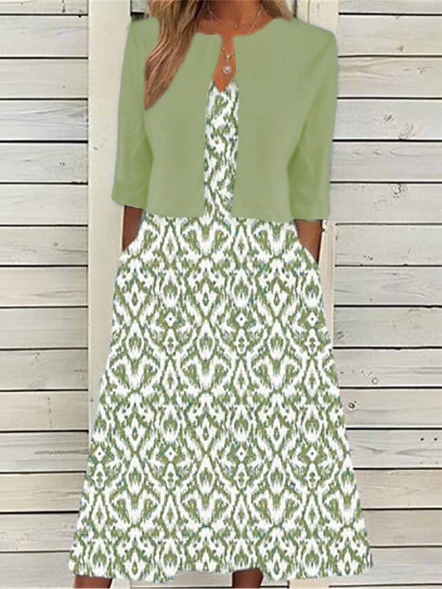 Women’s Two Piece Dress Set Casual Dress Print Dress Outdoor Daily Fashion Elegant Pocket Print Midi Dress V Neck Half Sleeve Geometric Regular Fit Blue Green Summer Spring S M L XL XXL