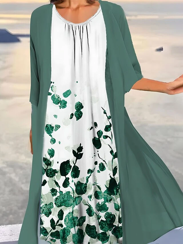 Women’s Two Piece Dress Set Casual Dress Print Dress Outdoor Daily Fashion Elegant Print Midi Dress Crew Neck 3/4 Length Sleeve Floral Ombre Loose Fit Light Green Blue Purple Summer Spring S M L XL