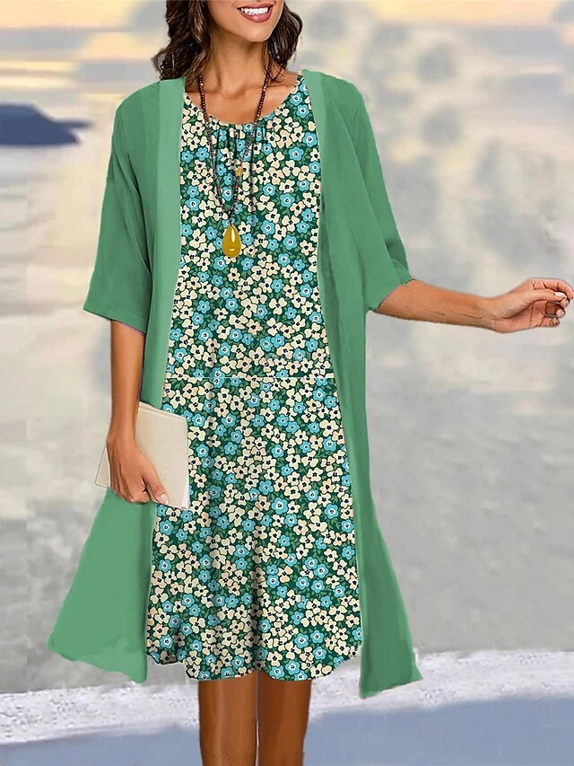 Women’s Two Piece Dress Set Casual Dress Print Dress Outdoor Daily Fashion Elegant Print Midi Dress Crew Neck 3/4 Length Sleeve Floral Regular Fit Navy Blue Green Gray Summer Spring S M L XL XXL