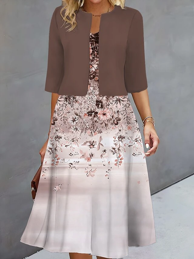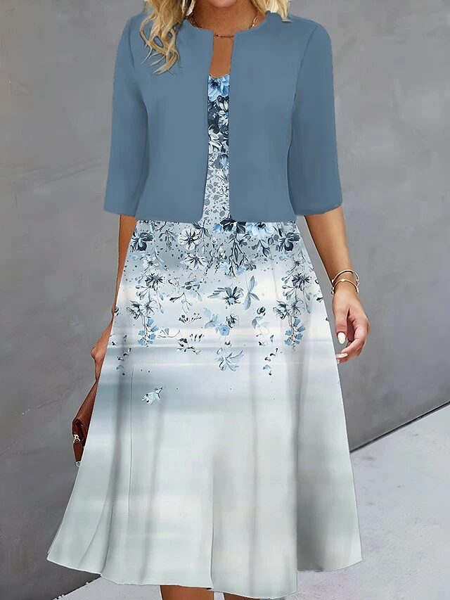 Women’s Two Piece Dress Set Casual Dress Print Dress Outdoor Daily Fashion Elegant Print Midi Dress V Neck Half Sleeve Floral Loose Fit Blue Brown Green Fall Winter S M L XL XXL