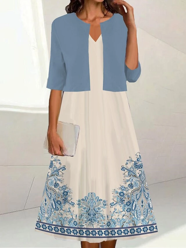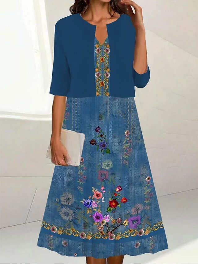 Women’s Two Piece Dress Set Casual Dress Print Dress Outdoor Daily Fashion Elegant Print Midi Dress V Neck Half Sleeve Floral Regular Fit Navy Blue Blue Green Summer Spring S M L XL XXL