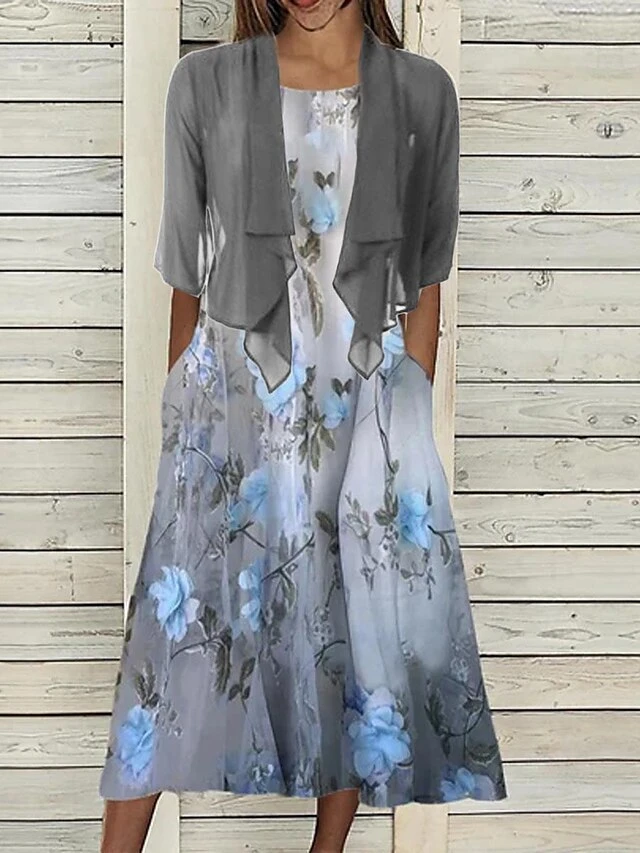 Women’s Two Piece Dress Set Casual Dress Print Dress Outdoor Daily Fashion Modern Pocket Print Midi Dress Crew Neck Half Sleeve Floral Regular Fit Blue Summer Spring S M L XL XXL