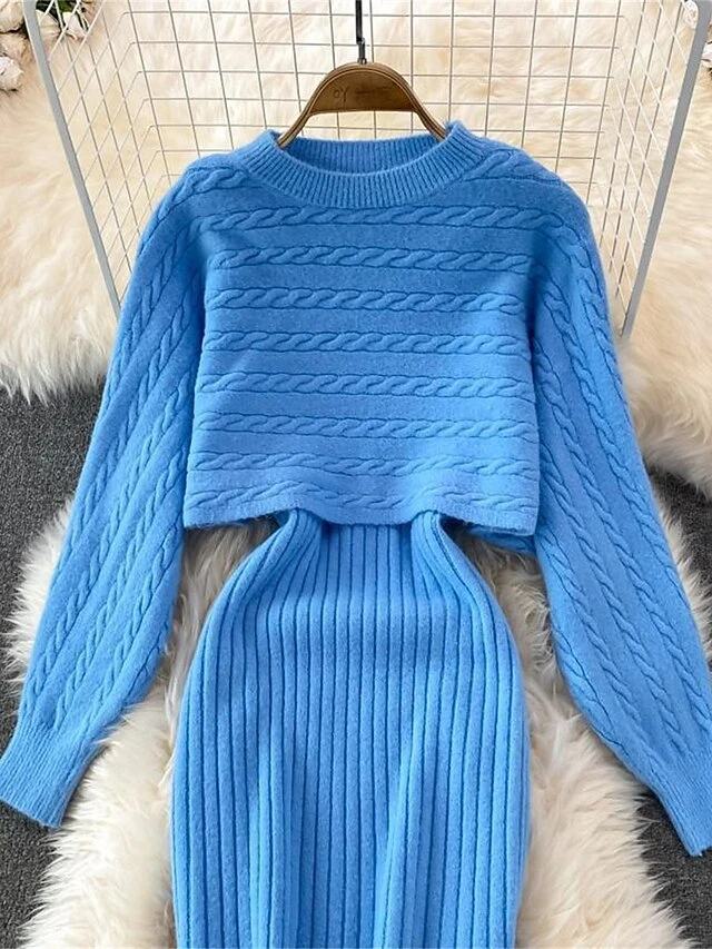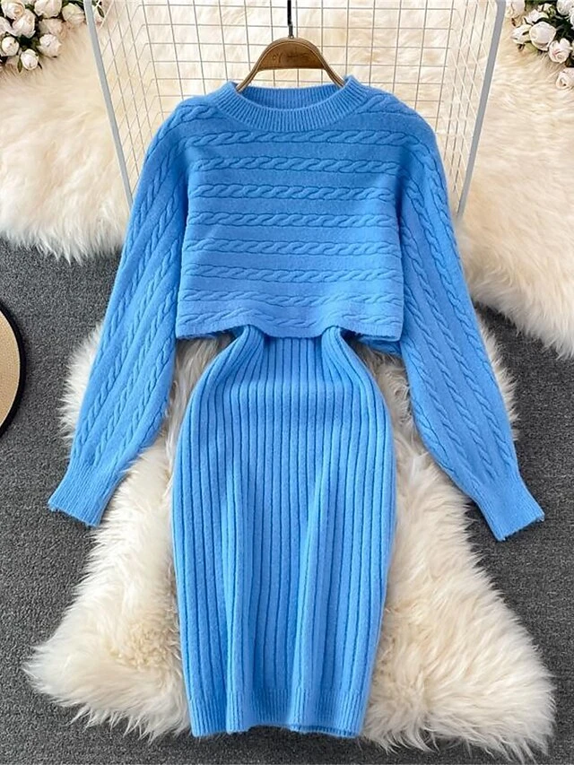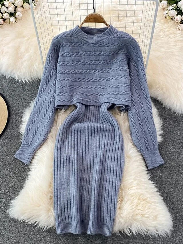 Women’s Two Piece Dress Set Casual Dress Sheath Dress Outdoor Daily Fashion Streetwear Ruched Midi Dress Crew Neck Long Sleeve Plain Loose Fit Black White Wine Fall Winter One-Size