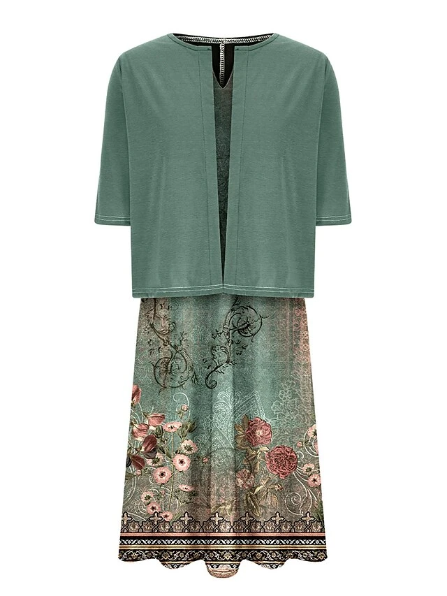 Women’s Two Piece Dress Set Casual Dress Shift Dress Daily Going Out Fashion Casual Pocket Print Midi Dress V Neck 3/4 Length Sleeve Floral Loose Fit Navy Blue Royal Blue Dark Green Summer Spring S M