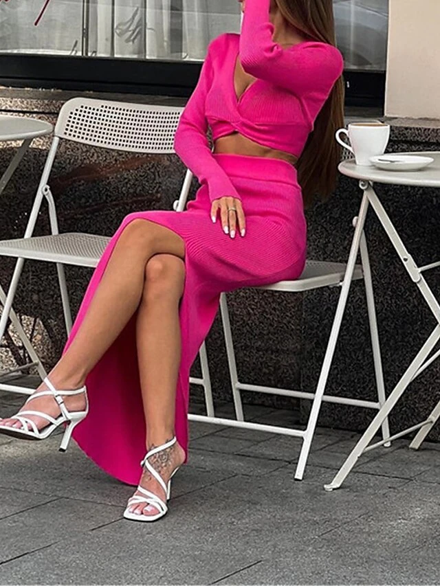 Women’s Two Piece Dress Set Casual Dress Skirt Set Daily Going Out Casual Split Midi Dress V Neck Long Sleeve Plain Slim Blue Rose Red Fall S M L