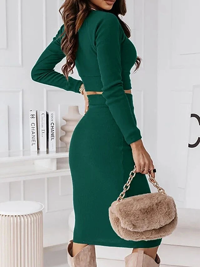 Women’s Two Piece Dress Set Casual Dress Skirt Set Outdoor Daily Fashion Sexy Ribbed Midi Dress Crew Neck Long Sleeve Plain Regular Fit Black Wine Green Fall Winter S M L XL