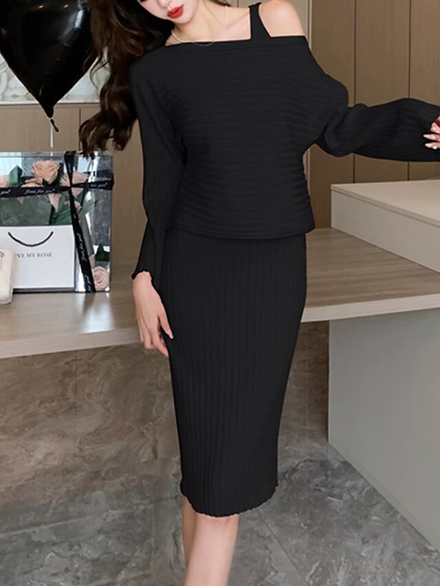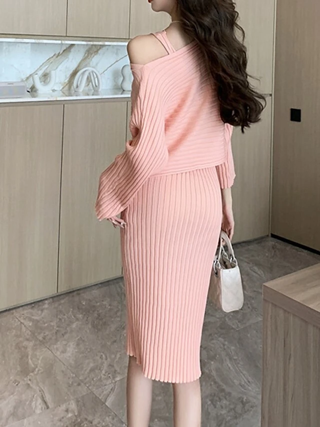 Women’s Two Piece Dress Set Casual Dress Skirt Set Outdoor Daily Fashion Streetwear Ruched Midi Dress V Neck Long Sleeve Plain Slim Black Pink Green Fall Winter One-Size