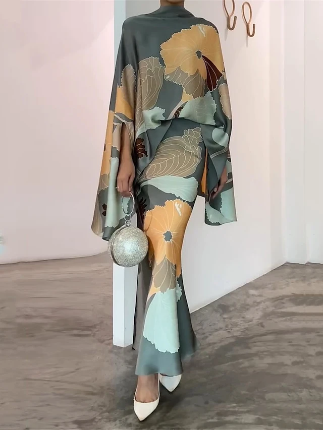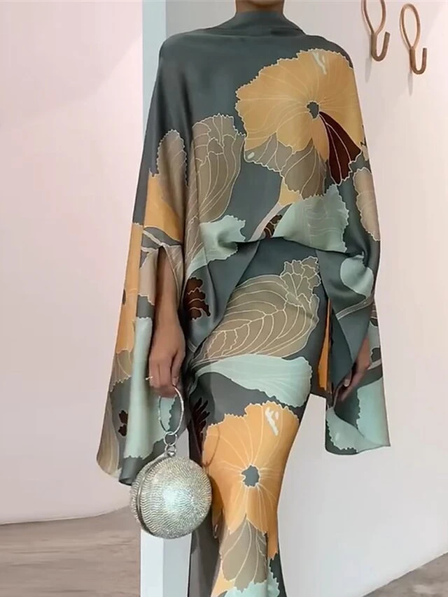 Women’s Two Piece Dress Set Casual Dress Skirt Set Outdoor Date Fashion Streetwear Print Long Dress Maxi Dress Stand Collar Long Sleeve Floral Regular Fit Green Fall S M L XL XXL