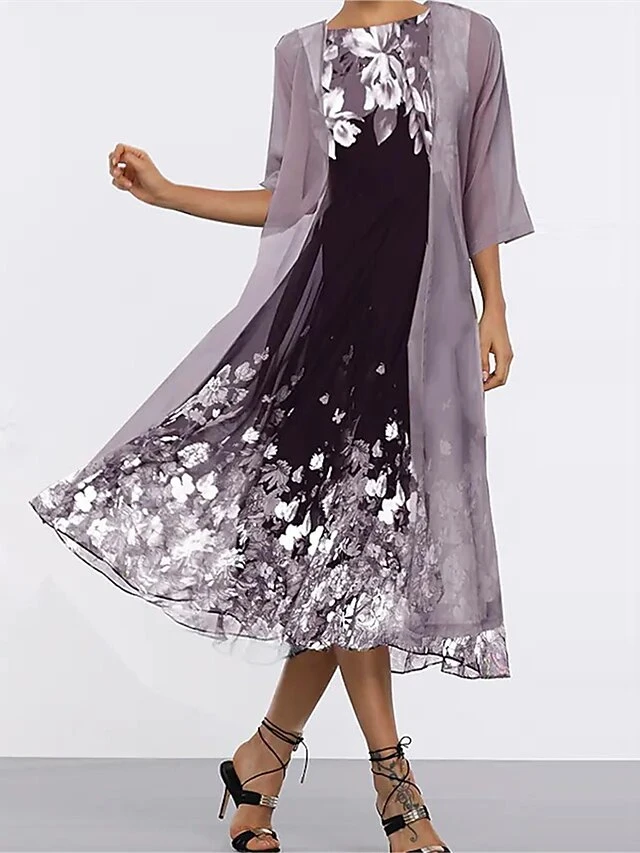 Women’s Two Piece Dress Set Casual Dress Swing Dress Daily Date Streetwear Modern Print Midi Dress Crew Neck Half Sleeve Floral Loose Fit Purple Gray Spring Fall M L XL XXL 3XL