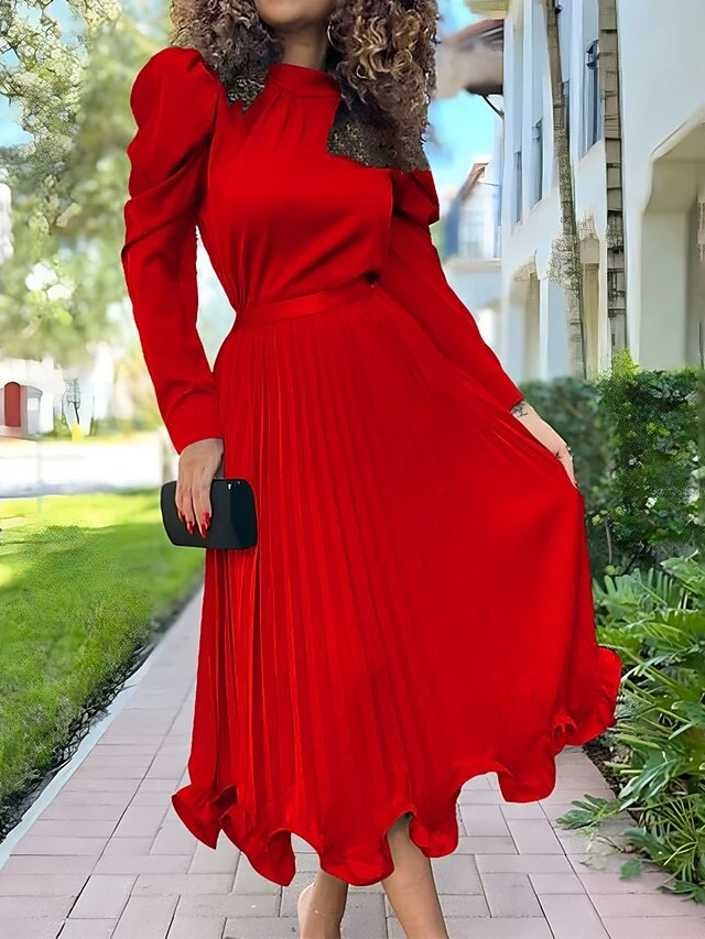 Women’s Two Piece Dress Set Party Dress Skirt Set Party Wedding Guest Fashion Party Pleated Ruffle Midi Dress Stand Collar Long Sleeve Plain Loose Fit White Yellow Red Fall Winter S M L XL XXL