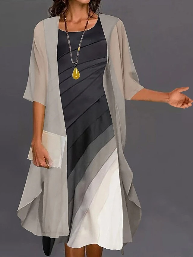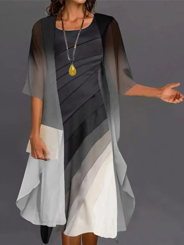 Women’s Two Piece Dress Set Shift Dress Chiffon Dress Daily Going Out Casual Print Maxi Dress Crew Neck Half Sleeve Ombre Loose Fit Black White Gray Summer Spring M L XL XXL XXXL