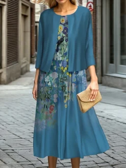 Women’s Two Piece Dress Set Skirt Set Swing Dress Home Christmas Punk Work Lace Up Patchwork Long Dress Maxi Dress Crew Neck Long Sleeve Color Block Rainbow Slim Blue Fall Winter S M L XL