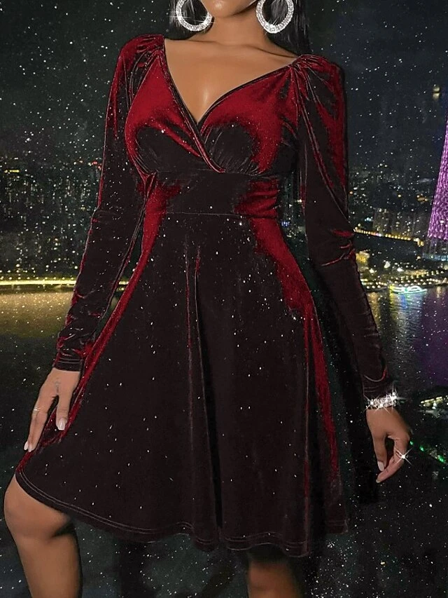 Women’s Wedding Guest Dress Velvet Dress Red Holiday Dress Claret Royal Blue Brown Black Long Sleeve Pure Color Patchwork Winter Fall V Neck Party Sexy Party Fall Dress 2023 S M L XL Winter Dress