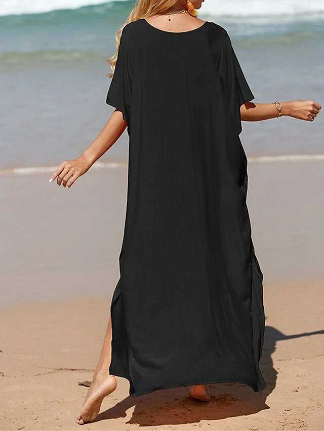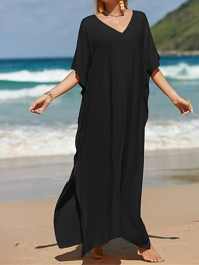 Women’s White Dress A Line Dress Cover Up Long Dress Maxi Dress Cotton Basic Casual Outdoor Daily Vacation V Neck Split 3/4 Length Sleeve Summer Spring Fall 2022 Loose Fit Black White Yellow Plain