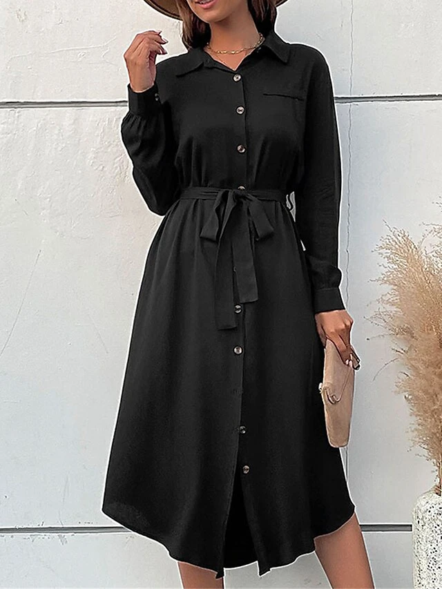 Women’s Work Dress Casual Dress Black Dress Fashion Office Daily Workfashion Midi Dress Lace Up Button Shirt Collar Long Sleeve Plain Loose Fit Black Fall Winter S M L XL