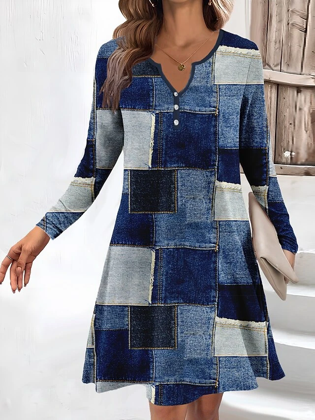 Women’s Work Dress Casual Dress Fashion Winter Dress Daily Mini Dress Button Print V Neck Long Sleeve Geometric Plaid Regular Fit Pink Blue Gray Fall Winter S M L XL XXL