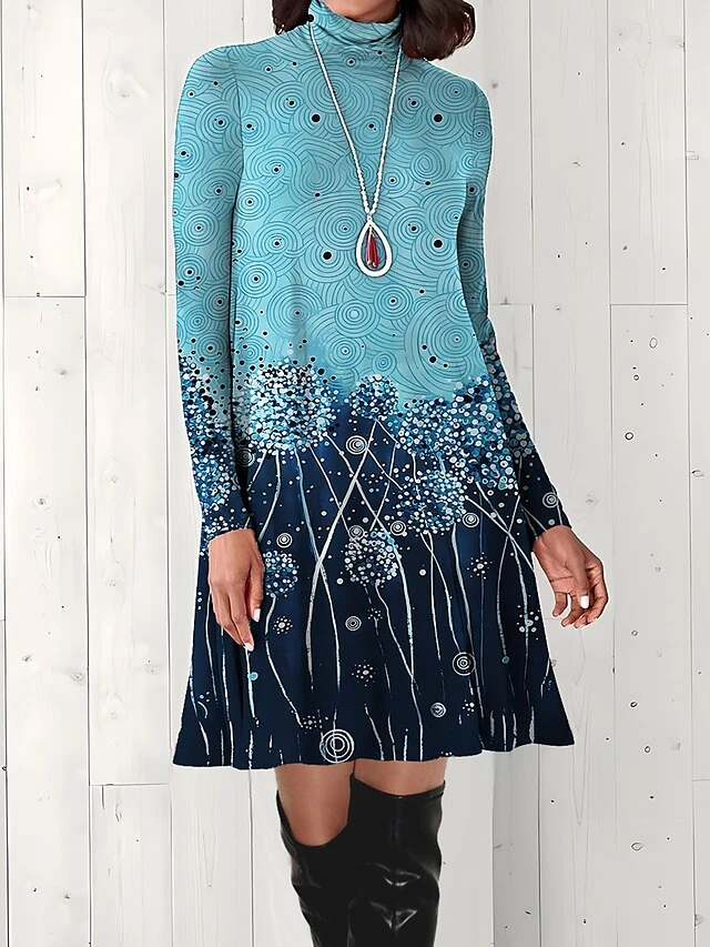 Women’s Work Dress Casual Dress Fashion Winter Dress Daily Mini Dress Print Turtleneck Long Sleeve Dandelion Regular Fit Blue Dark Green Green Fall Winter S M L XL XXL