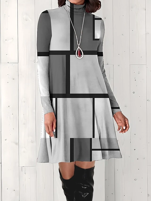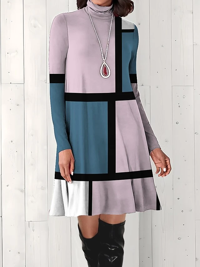 Women’s Work Dress Casual Dress Fashion Winter Dress Daily Mini Dress Print Turtleneck Long Sleeve Geometric Plaid Regular Fit Pink Blue Gray Fall Winter S M L XL XXL