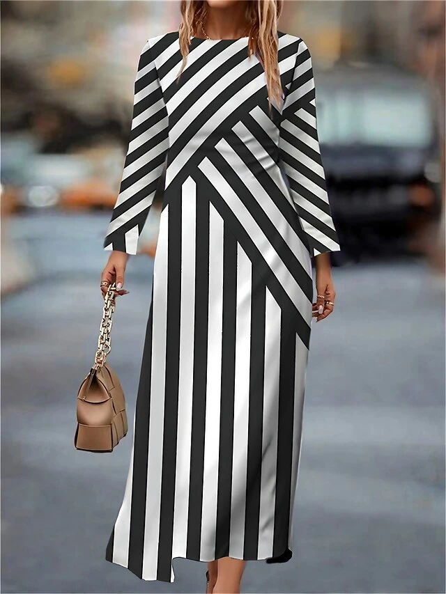 Women’s Work Dress Casual Dress Semi Formal Dress Fashion Winter Dress Daily Midi Dress Print Crew Neck Long Sleeve Stripe Slim Black Fall Winter S M L XL XXL