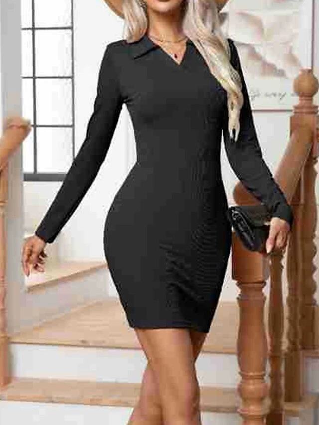 Women’s Work Dress Casual Dress Sheath Dress Fashion Office Daily Workfashion Mini Dress Ruched Shirt Collar Long Sleeve Plain Regular Fit Black Khaki Army Green Fall Winter S M L XL XXL