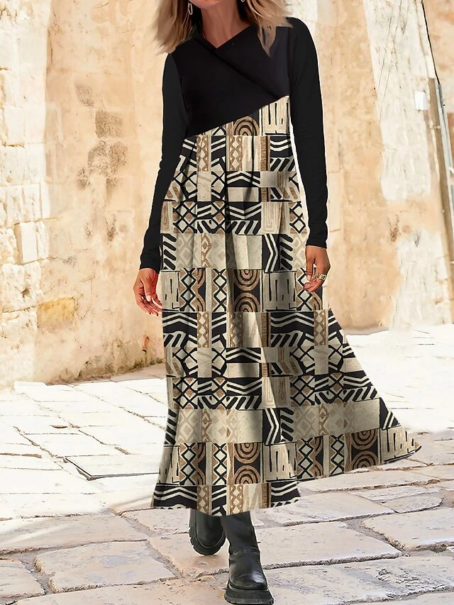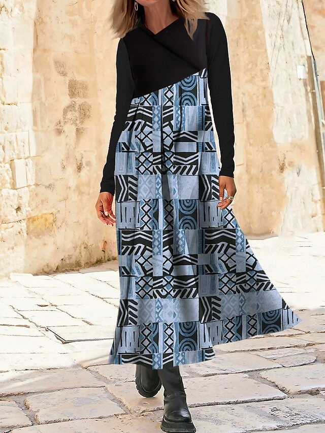 Women’s Work Dress Casual Dress Swing Dress Fashion Winter Dress Daily Long Dress Maxi Dress Button Print V Neck Long Sleeve Color Block Tribal Regular Fit Royal Blue Blue Green Fall Winter S M L XL