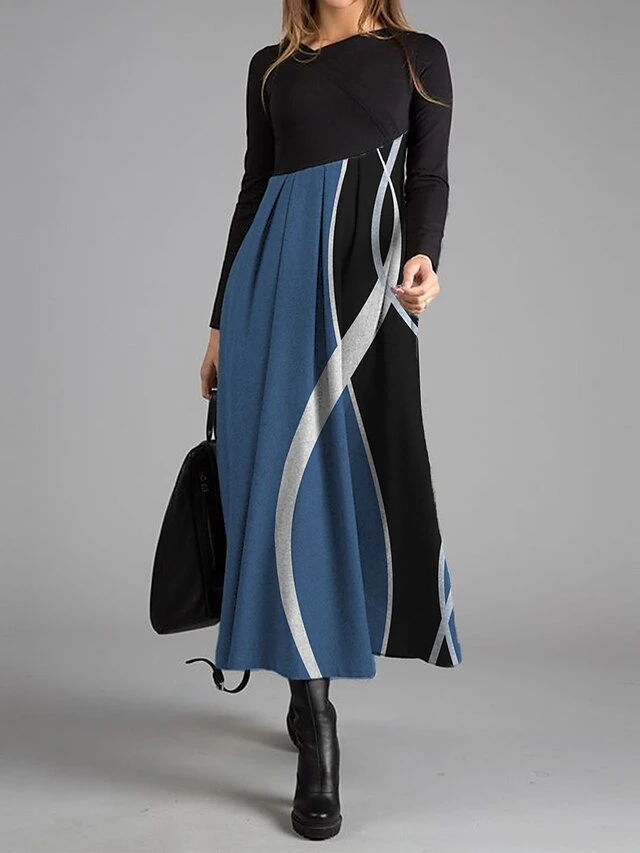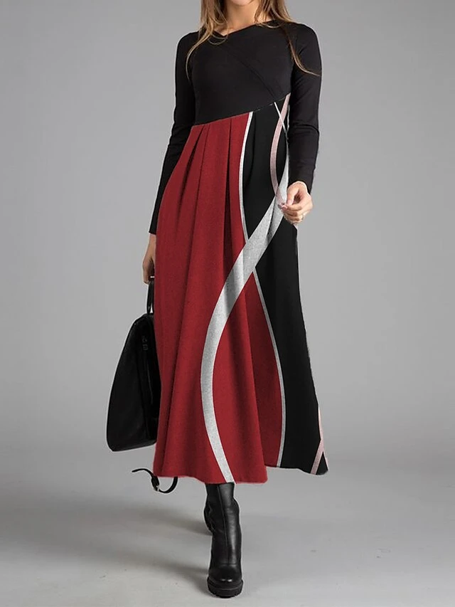 Women’s Work Dress Casual Dress Swing Dress Fashion Winter Dress Daily Long Dress Maxi Dress Button Print V Neck Long Sleeve Geometric Color Block Regular Fit Red Blue Brown Fall Winter S M L XL XXL