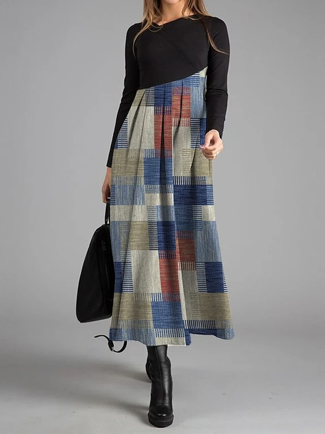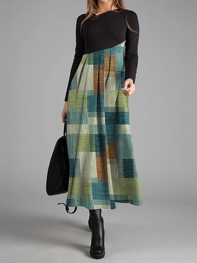 Women’s Work Dress Casual Dress Swing Dress Fashion Winter Dress Daily Long Dress Maxi Dress Button Print V Neck Long Sleeve Geometric Plaid Regular Fit Blue Green Khaki Fall Winter S M L XL XXL