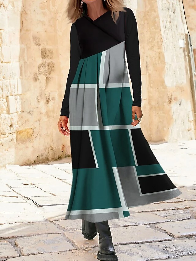 Women’s Work Dress Casual Dress Swing Dress Fashion Winter Dress Daily Long Dress Maxi Dress Button Print V Neck Long Sleeve Geometric Plaid Regular Fit Pink Orange Green Fall Winter S M L XL XXL