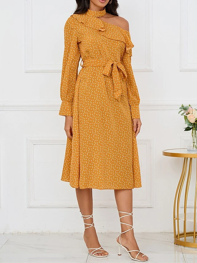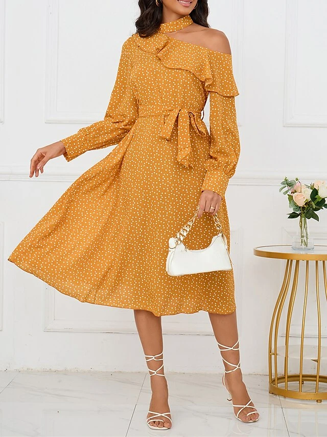 Women’s Work Dress Casual Dress Swing Dress Fashion Winter Dress Daily Midi Dress Lace Up Ruched Crew Neck Long Sleeve Floral Loose Fit Yellow Fall Winter S M L XL