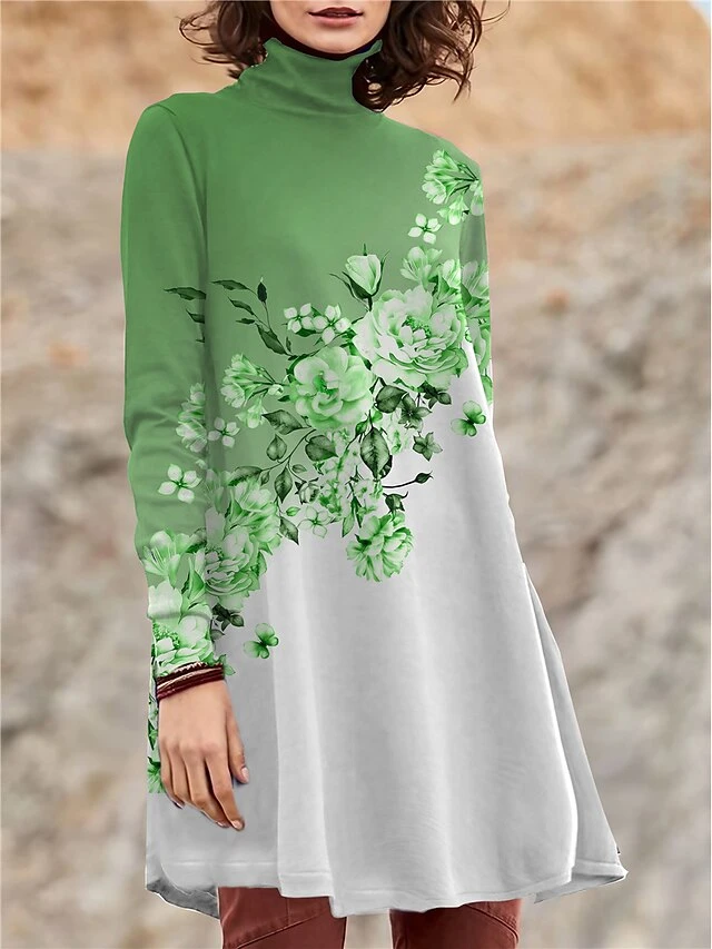 Women’s Work Dress Casual Dress Swing Dress Fashion Winter Dress Daily Mini Dress Print Turtleneck Long Sleeve Floral Regular Fit Pink Blue Purple Fall Winter S M L XL XXL