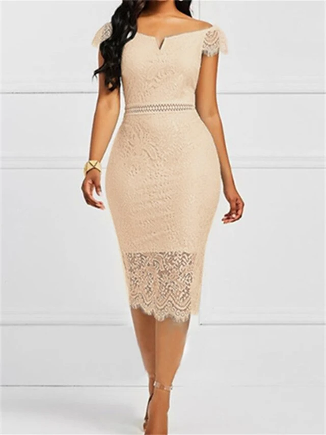 Women’s Work Dress Party Dress Lace Dress Fashion Lace Sleeve Midi Dress Lace Off Shoulder Short Sleeve Plain Regular Fit Black White Navy Blue Summer Spring S M L XL
