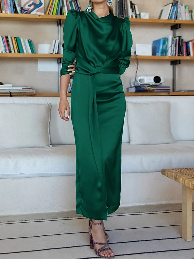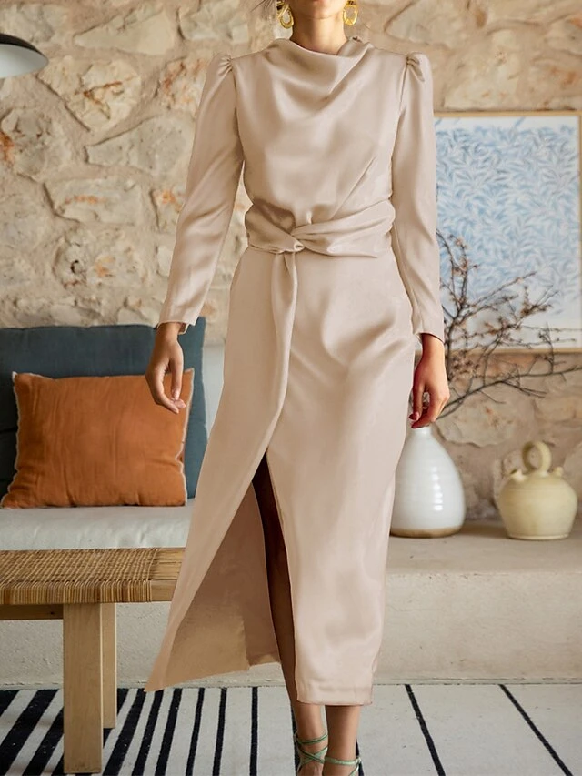 Women’s Work Dress Satin Dress Semi Formal Dress Fashion Long Dress Maxi Dress Split Stand Collar Long Sleeve Plain Regular Fit Black Blue Sky Blue Fall Winter S M L XL