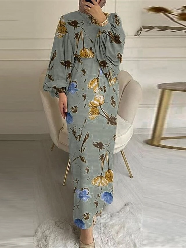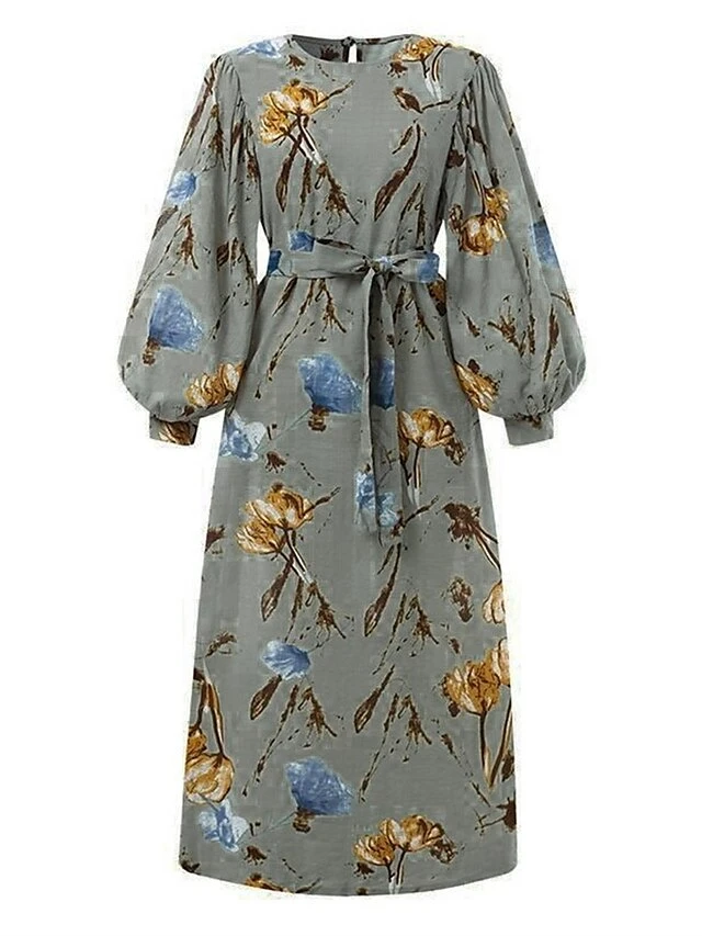 Women’s Work Dress Sheath Dress Semi Formal Dress Fashion Long Dress Maxi Dress Print Crew Neck Long Sleeve Floral Loose Fit Army Green Apricot Fall Winter S M L XL XXL